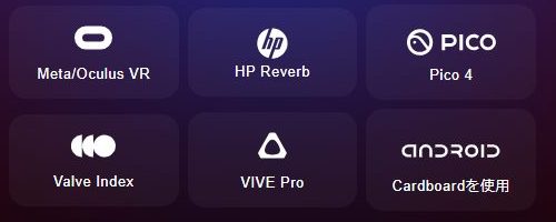 対応VRデバイスは「Meta/Oculus VR」「HP Reverb」「Pico 4」「Valve index」「VIVE Pro」です。